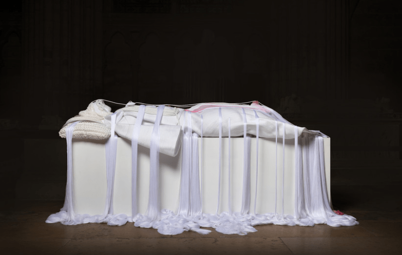 Fin dalla prima sala, la candida Gisante de cœur di Jeanne Vicerial mette in evidenza alcune caratteristiche fondamentali della mummificazione: la conservazione delle viscere e la posizione del corpo disteso, in attesa della Resurrezione. Tra i drappeggi plissettati realizzati con la tecnica del tricotissage, l’artista inserisce rose verniciate che segnalano la posizione del cuore e degli organi vitali. Accanto a questa evocazione contemporanea dei giacenti medievali, un maschera mortuaria ricorda la tradizione del calco dei volti o delle mani di personaggi celebri.