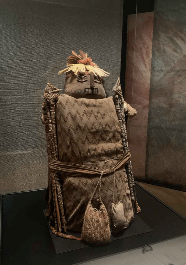 Accanto alle altre due mummie sudamericane presentate in mostra – l’uomo chachapoya delle Ande, datato tra il XII e il XVI secolo, e la giovane donna proveniente dalla regione di Atacama, vissuta tra l’VIII e il X secolo – figura un bambino Chancay, racchiuso in un fardo. Questo involucro funerario è costituito da numerosi strati di tessuto, circondati da bastoni rivestiti di cotone. Il corpo, collocato all’interno, è stato eviscerato, essiccato, disposto a testa in giù e accompagnato da pannocchie di mais. Una testa artificiale coronata di piume sovrasta l’insieme, restituendogli una silhouette umana e nobile.