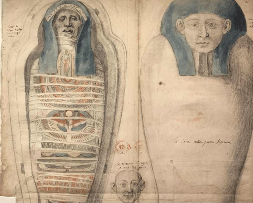 A partire dal Rinascimento, le mummie fanno il loro ingresso nei gabinetti delle curiosità dei principi collezionisti. Questo disegno, incluso in un taccuino di appunti e conservato presso la Bibliothèque nationale de France, è probabilmente una delle prime rappresentazioni di un corpo mummificato in Europa. Se il corpo con le sue bende, gli amuleti e il sarcofago — un tempo appartenuti al pittore Peter Paul Rubens — sono andati perduti, rimangono queste tre figure disegnate dall’artista, testimonianza del crescente interesse per queste impressionanti tracce del passato.