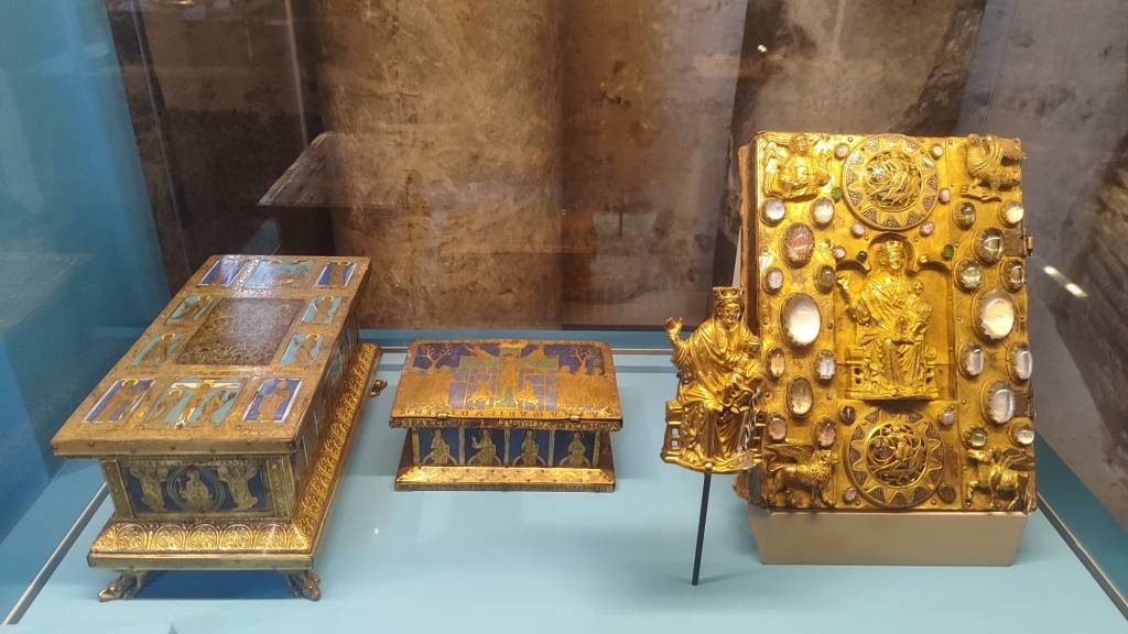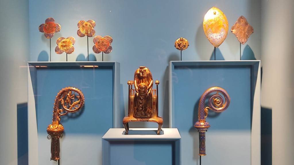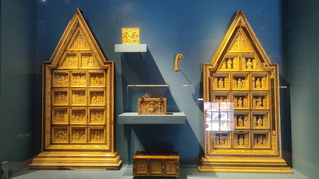 Il percorso espositivo costruisce un dialogo serrato tra opere medievali e le loro “risonanze” ottocentesche. Non si tratta soltanto di confronti formali, ma di veri cortocircuiti temporali: un calice neo-medievale dialoga con un originale romanico; una broderie ottocentesca replica con stupefacente fedeltà un opus anglicanum del Quattrocento; un reliquiario diventa modello per riproduzioni autorizzate e seriali, come quelle realizzate dalla maison Christofle alla fine del secolo.