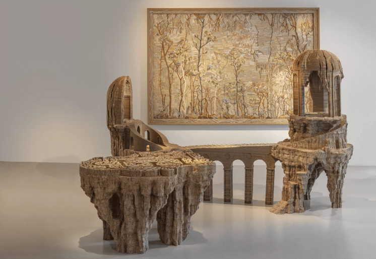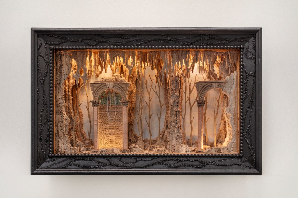 Il riferimento al manierismo italiano del XVI secolo è evidente, ma mai citazionista. Le grotte artificiali dei giardini barocchi, le follies architettoniche, le ninfe, le fontane, i templi: tutto questo lessico viene assorbito e restituito come fossile, come traccia. Le superfici in cartone, incise fino allo sfinimento, evocano rocce, cortecce, sedimenti geologici. È un mondo che sembra nato dopo la scomparsa dell’uomo, ma costruito con una memoria profondamente umana.